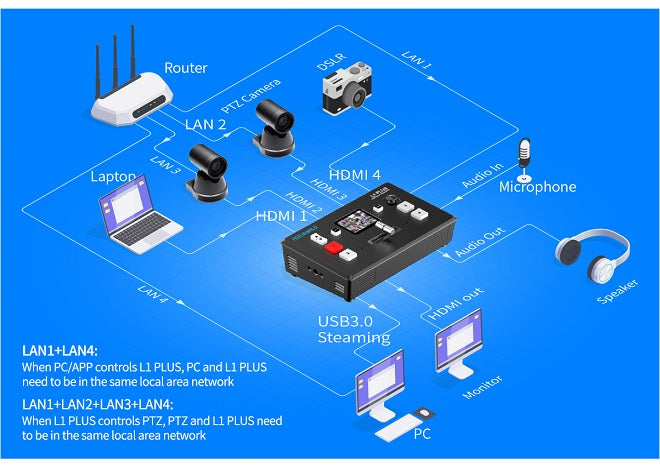 L1 PLUS adalah untuk pembuat video atau siapa saja yang ingin membuat program multi-kamera kualitas siaran secara sederhana dan cepat dari mana saja. Anda dapat streaming langsung ke YouTube/Facebook/Instagram atau menggunakan Skype atau ZOOM untuk presentasi bisnis yang inovatif, dengan mudah mengontrol setiap layar dengan kamera PTZ, dan menyimpan hingga 8 adegan untuk peralihan cepat. Yang terbaik dari semuanya, L1 PLUS adalah plug and play, Anda tidak perlu menjadi profesional video untuk mendapatkan hasil yang tampak hebat.